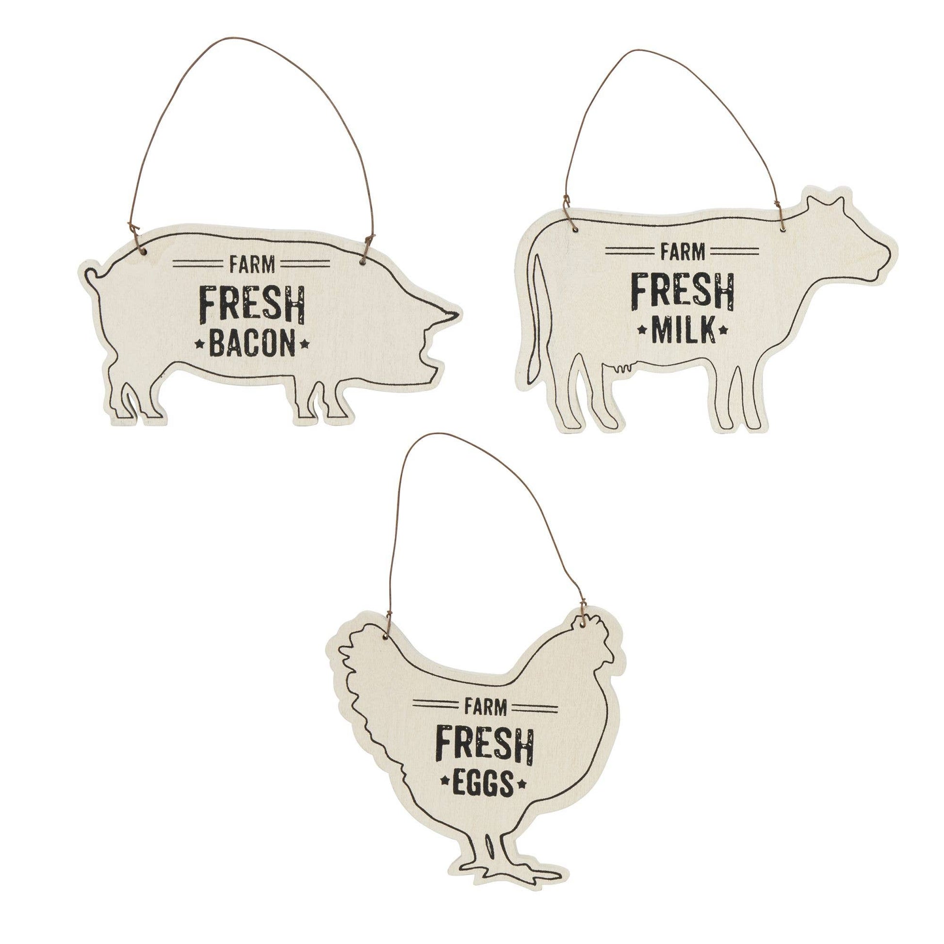 Cow, Pig, Chicken Ornaments are a set of three wooden ornaments in farm animal shapes. Ornaments feature a cow, pig, and chicken silhouette and reads, "farm fresh eggs," "farm fresh milk," and, "farm fresh bacon" in bold black text. Ornaments hang by a metal wire hanger and look great hung on a nail, knob, or hook for a simple country accent. Chicken measures 4.5" wide by 5" high; cow measures 6" wide by 5.5" high; pig measures 5" wide by 4" high.