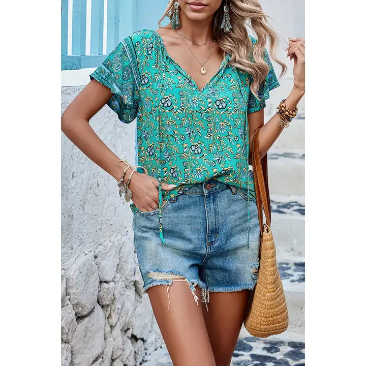 Boho Floral Patchwork V Neck Top