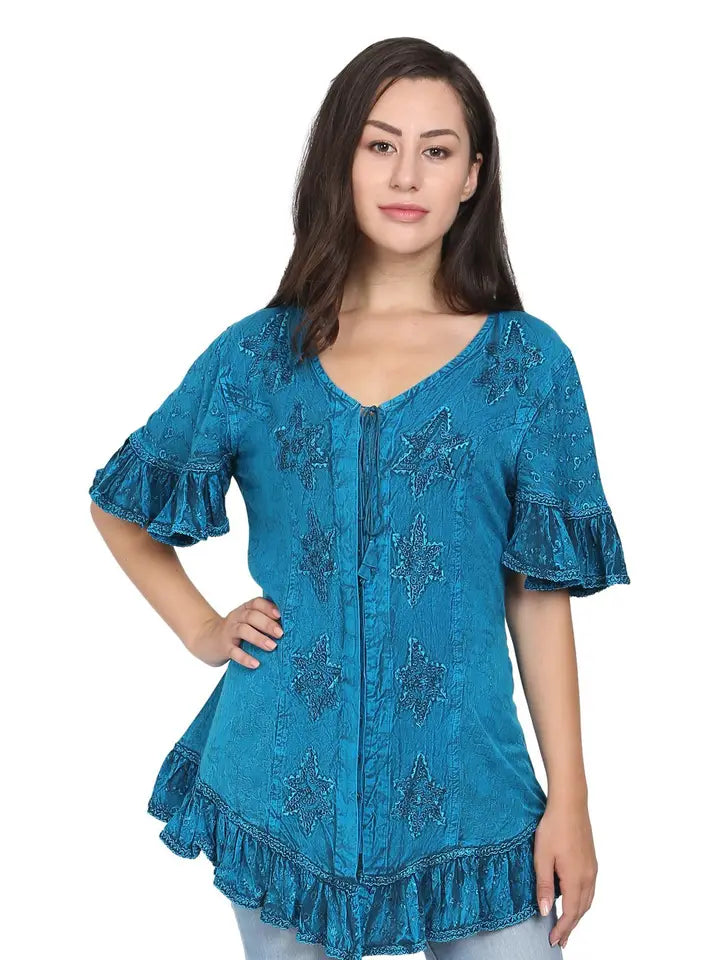 This Advance Apparels Renaissance inspired Celtic blouse is made with our premium acid wash rayon fabric. All products are designed and produced by skilled artisans in India. This blouse features a three quarter sleeve and a plain acid wash finish providing simplicity and style. This blouse can be layered in the fall at a Renaissance Fair or worn as a standalone in warmer weather. Handmade in India100% Rayon