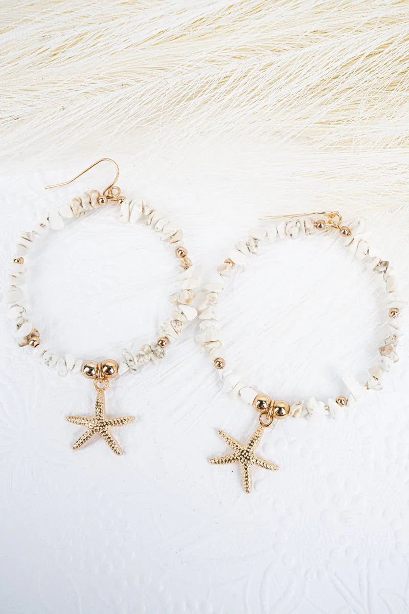 Make a statement with these eye-catching sea life earrings. Goldtone, Faux Chip Stone Beads, Starfish Charm, 3.5" Fish Hook Style Earrings with 3" Drop, Lead & Nickel Compliance