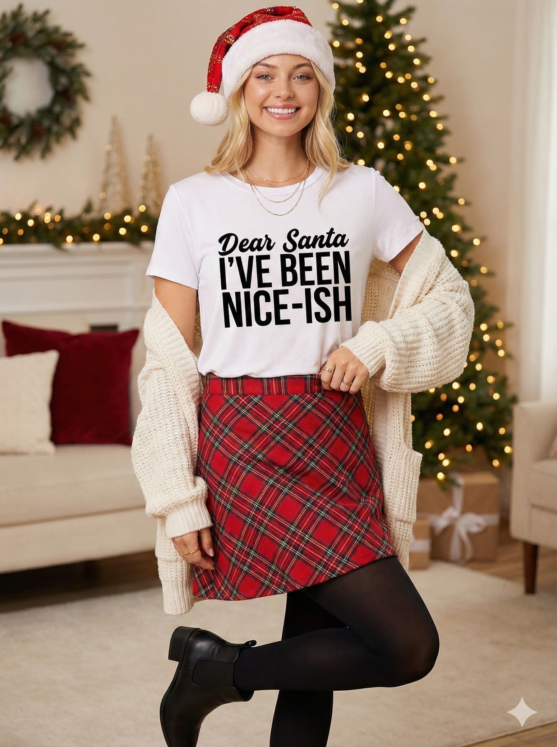 Bring playful cheer to your holiday wardrobe with our "Dear Santa, I've Been Nice-ish" Graphic Tee. Designed in a soft white knit, this festive favorite features bold black lettering in a mix of script and block fonts that make a fun, cheeky statement. Its relaxed fit and classic crew neckline make it perfect for cozy holiday gatherings, gift exchanges, or layering under your favorite cardigans all season long.