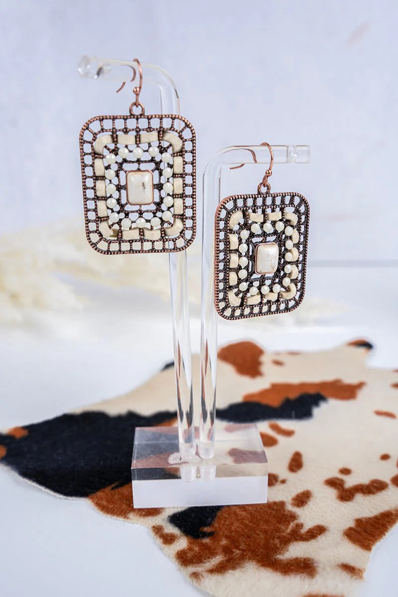 The faux leather and turquoise make for a stunning effect on these amazing western earrings. Textured Burnished Coppertone, Faux Stone Beads, Interwoven Faux Leather Cord, Turquoise Faceted Beads, Cut-Out Design, 2" Fish Hook Style Earrings with 1.5" Drop, Lead Compliant