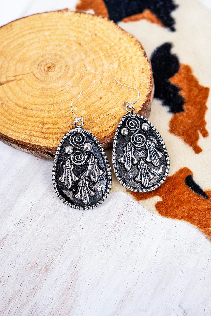 Elevate your look with these unique earrings! Silvertone with Black Detailing, Raised Design, 2.25" Fish Hook Earrings with 1.75" Drop, Lead & Nickel Compliant