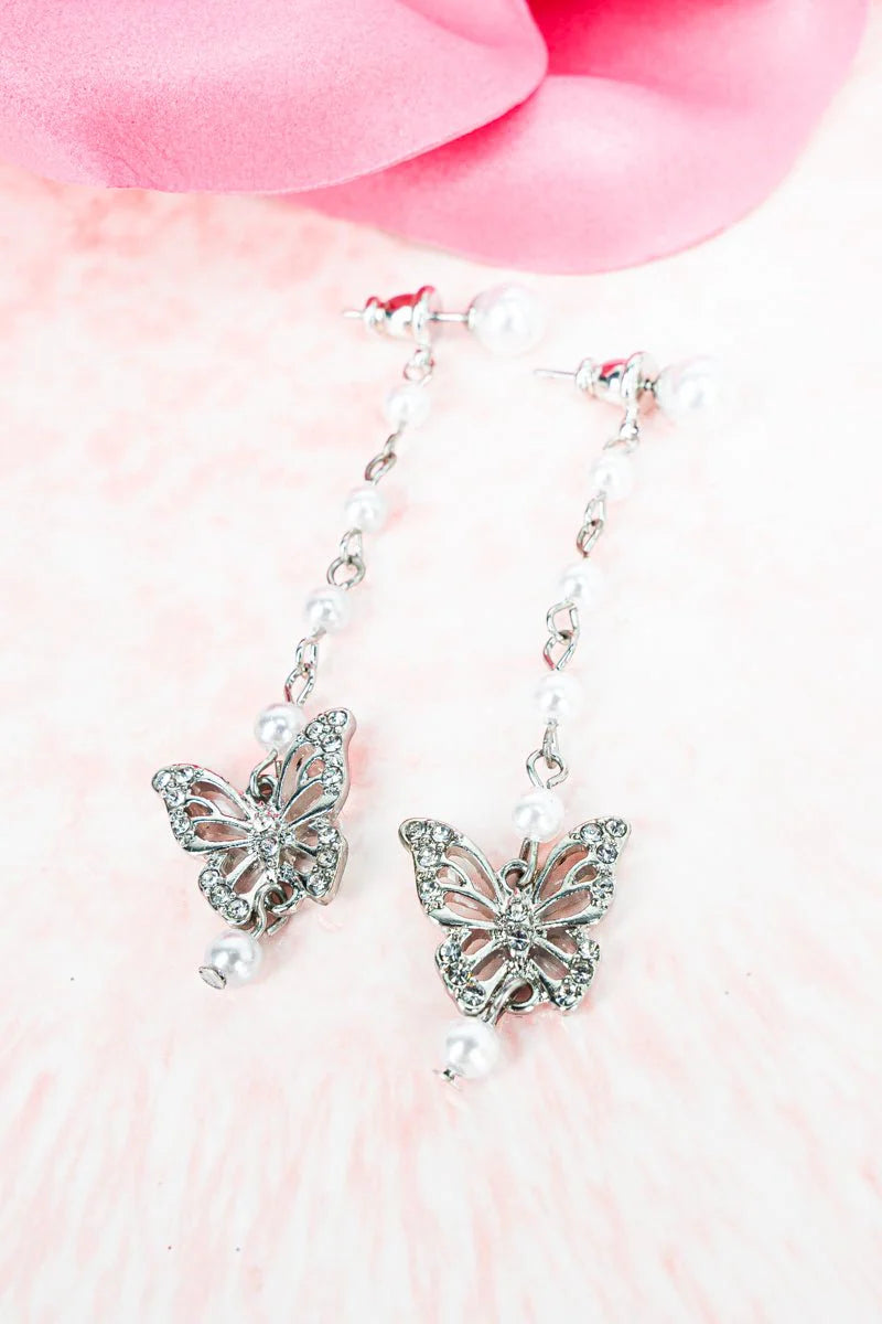 Get a dazzling look with these pearl and butterfly jacket earrings! Silvertone, Crystal Accents, Faux Pearls, 3.25" Post Style Earrings, Lead & Cadmium Compliant