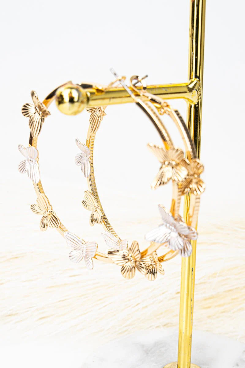 These pretty hoops will accentuate your look. Smooth and Textured Goldtone, Colored Metal, Butterfly Accents, 2.25" Post Style Earrings, Hinged Back Closure, Lead & Nickel Compliance