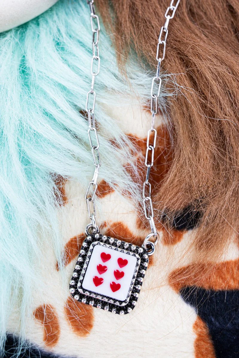 Deal yourself into style with this playful necklace! Perfect for game nights, festivals, or whenever you want to shuffle up your look with a little Vegas flair! 17" Long with 3" Extender, Lobster Claw Closure, Burnished Silvertone,Enamel, Textured Detailing, Heart or Spade Dice Design, .75" x .75" Pendant, Lead & Nickel Compliance