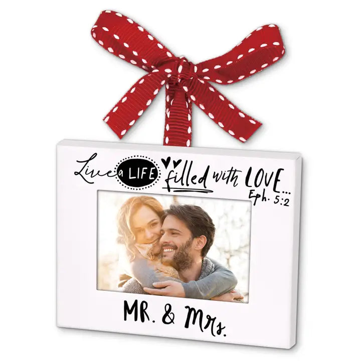 This Photo Frame Ornament Is A Wonderful Way To Showcase Your Favorite Memories. Made With A White Metal Finish And Red Ribbon To Hang, The Printed Title And Scripture On This Ornament Makes An Elegant Display On Your Christmas Tree. Perfect To Give As A Gift. Comes In A Gift Box.