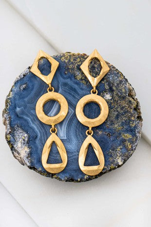 Three geo shape openwork hoop linked earrings. Made of alloy casting. From top to bottom: diamond shape, circle, teardrop. Worn gold plating. size: 0.75" x 3.25"