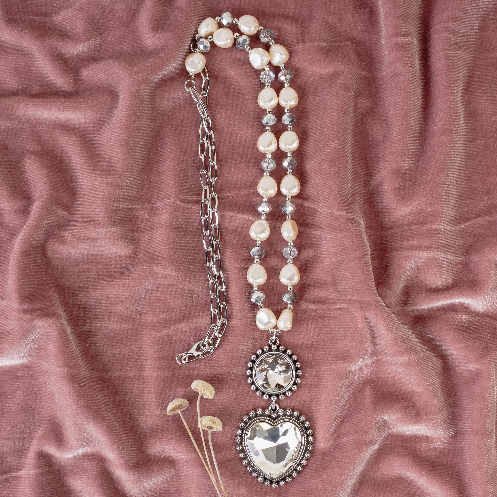 Crystal Heart Necklace, Crystal Pendant with Pearl Accents, Link Chain - 30" in Length