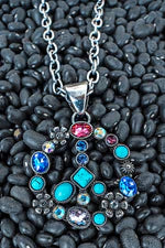 A little retro, a lot of style. 18" Long Necklace with 3" Extension, Lobster Claw Closure, Burnished Silvertone, Iridescent and Colored Rhinestones, Faux Stone Beads, Flower and Sunburst Accents, Twisting Rope Textured, 2.5" x 1.75" Peace Sign Pendant (Including Loop), Lead & Nickel Free