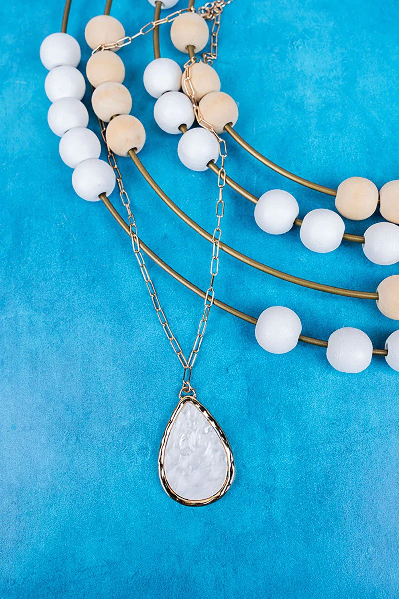 Add whimsy to your outfit with this fun pendant necklace. 18" Long with 3" Extender, Lobster Claw Closure, Goldtone, Faux Mother of Pearl, Cut-Out Metal Backing, 1.75" Teardrop Pendant, Lead Compliant