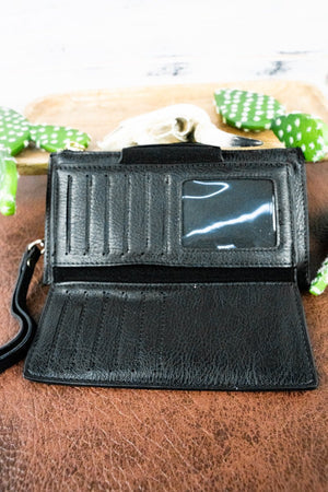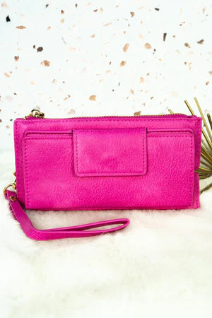 Sleek faux leather wristlet wallet is a stylish and functional accessory that can be used alone or along with a purse or tote! Faux Leather Construction, Main Section with Zip Top Closure, Front Section with Magnetic Snap Closure, Main Section has 2 Open Pockets and 1 Slim Center Slot, Front Section has 11 Credit Card Slots, 1 Clear-View ID Window, and 2 Bill Pockets, Removable Wristlet Strap, 7.5" Wide x 4" Tall x 1.5" Deep (Total)