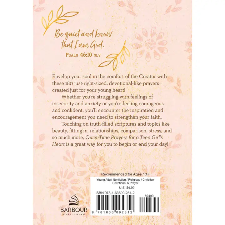 You will envelop your soul in the comfort of the Creator as you read through 180 just-right-sized, devotional-like prayers that will meet you right where you are. Whether you're struggling with feelings of insecurity and anxiety or you're feeling courageous and confident, you will encounter just the inspiration and encouragement you need to strengthen your faith. Touching on truth-filled scriptures and topics like beauty, fitting in, relationships, comparison, stress, and so much more, Quiet-Time Prayers for a Teen Girl's Heart is a great way for you to begin or end your day!