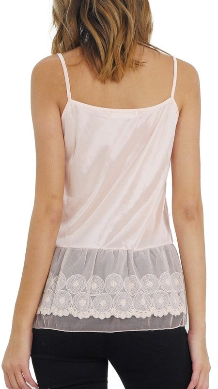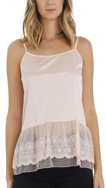 CIRCLE LACE HEM SATIN CAMISOLE AND TOP EXTENDER CONVERTIBLE. Fabric Contents: 100% POLYESTER