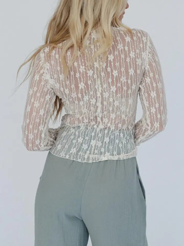 Sexy fitted long sleeve top in precious lace made. Classic mock neckline, fitted long sleeves and lettuce hem detailing throughout. Pretty delicate and sheer floral lace top, how graceful and lustful. This lace top is a stunning piece perfect for layering or wearing on its own with bralette. • Fabric: 90%Polyamide+10%Elastane