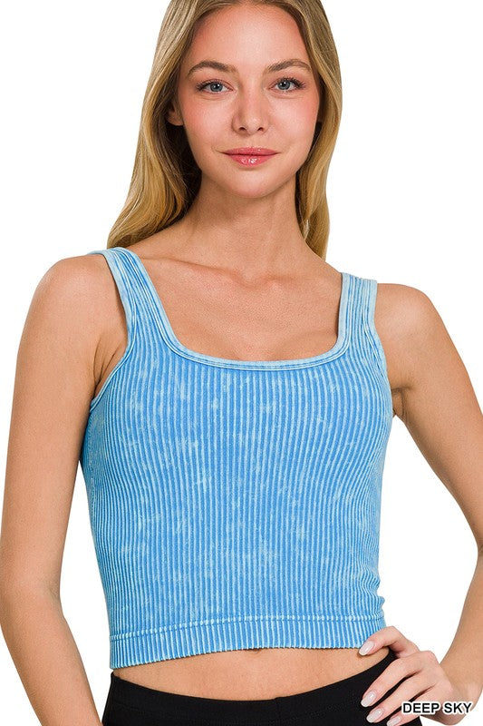 STONE WASHED RIBBED SEAMLESS WITH BRA PADS **REMOVABLE BRA PADS** TOTAL BODY LENGTH: 16.5", BUST: 22.5" approx. - MEASURED FROM S/M ** COLOR MAY VARY SLIGHTLY DUE TO MONITOR RESOLUTION. Fabric Contents: 90% NYLON 10% SPANDEX