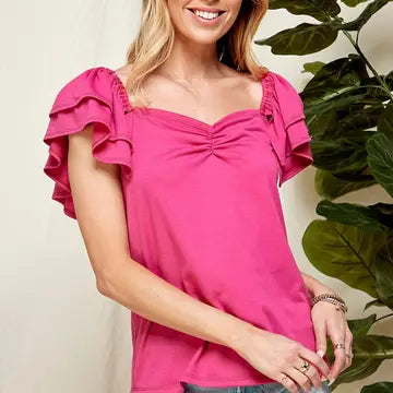 Elevate your feminine charm with this lovely top. It features a flattering sweetheart neckline that accentuates your decolletage and adds a touch of romance to your look. The double ruffled sleeves create a playful and whimsical effect, adding movement and flair to the design. Whether you're attending a special occasion or simply want to make a fashion statement, this top is sure to impress. The combination of the sweetheart neckline and double ruffled sleeves adds a touch of elegance and sophistication to any outfit. Pair it with jeans, skirts, or trousers for a versatile and stylish ensemble. Stand out from the crowd and embrace your inner fashionista with it. • Made in United States • Fabric: 68% Polyester 28% Rayon 4% Spandex