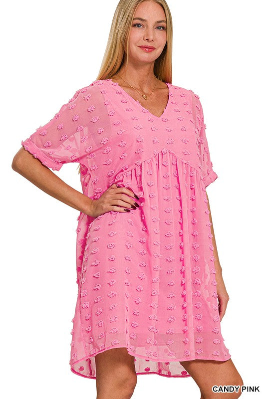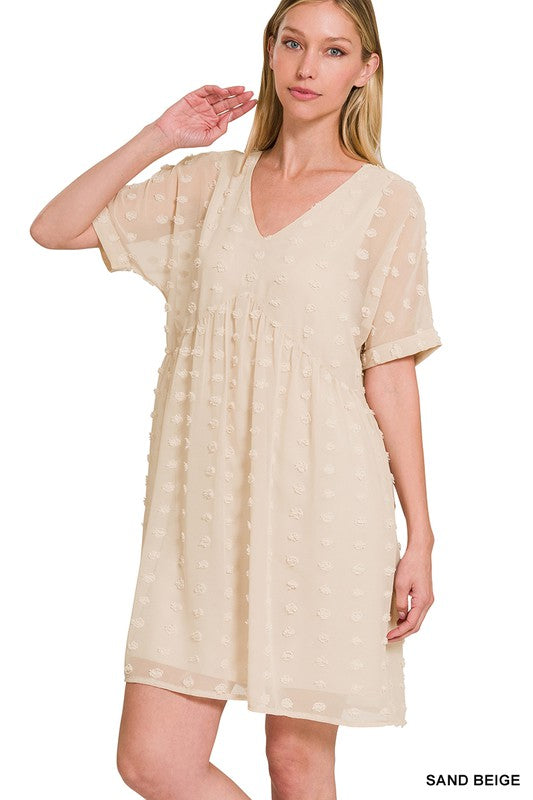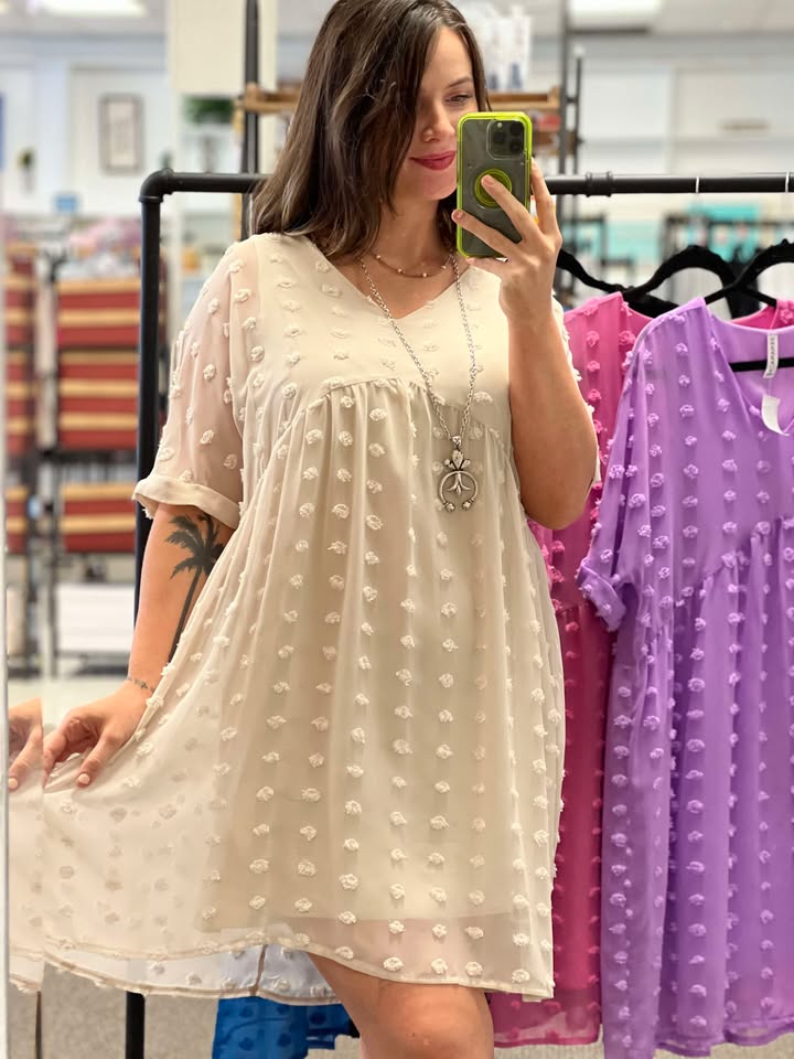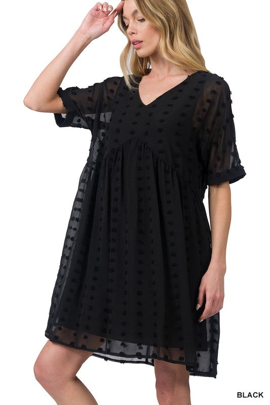 SWISS DOT BABYDOLL V-NECK DRESS - LINED TOTAL BODY LENGTH: 35.5", BUST: 40" approx. - MEASURED FROM SMALL * COLOR MAY VARY SLIGHTLY DUE TO MONITOR RESOLUTION. Fabric Contents: 100% POLYESTER