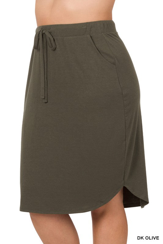 PLUS ELASTIC WAIST SELF TIE TULIP HEM SKIRT WITH SIDE POCKETS TOTAL BODY LENGTH (Front including Band): 25.5", WAIST: 33" approx. - MEASURED FROM 1X * COLOR MAY VARY SLIGHTLY DUE TO MONITOR RESOLUTION. Fabric Contents: 57% POLYESTER 38% RAYON 5% SPANDEX
